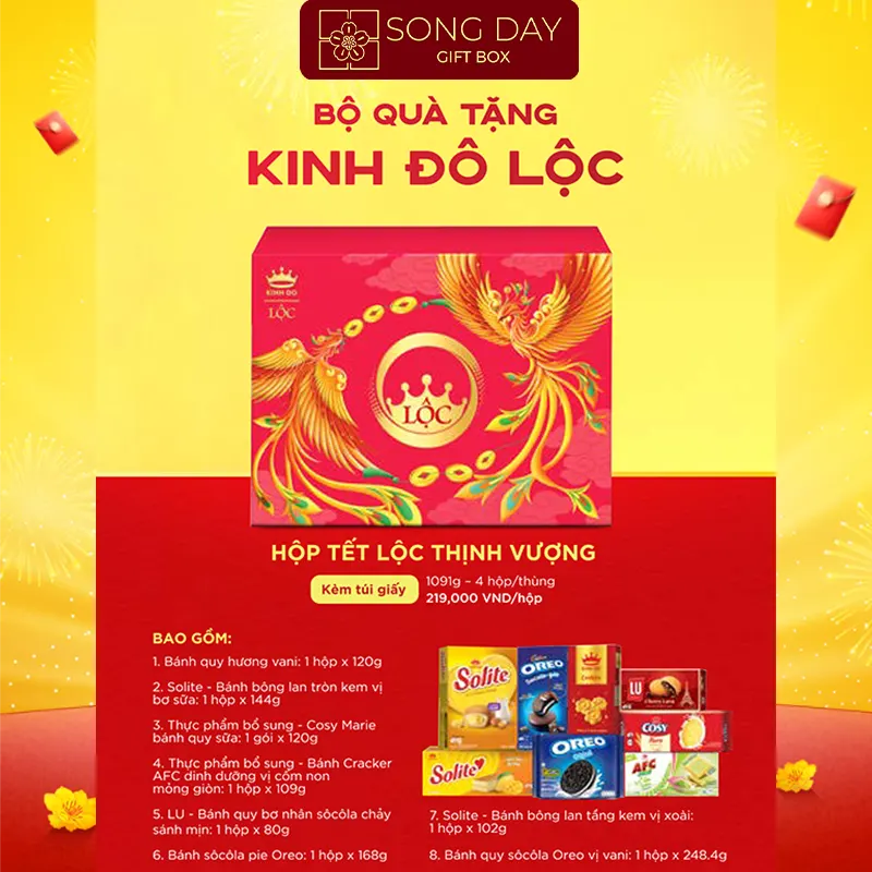 Bộ quà tặng Tết Kinh Đô Lộc Thịnh Vượng từ Kinh Đô là sự kết hợp hoàn hảo giữa nét đẹp truyền thống và hơi thở hiện đại. Với thiết kế hộp giấy cứng cáp, hoa văn tinh xảo và hiệu ứng in ấn cao cấp, đây chính là món quà đẳng cấp để gửi gắm lời chúc an khang đến đối tác và người thân.